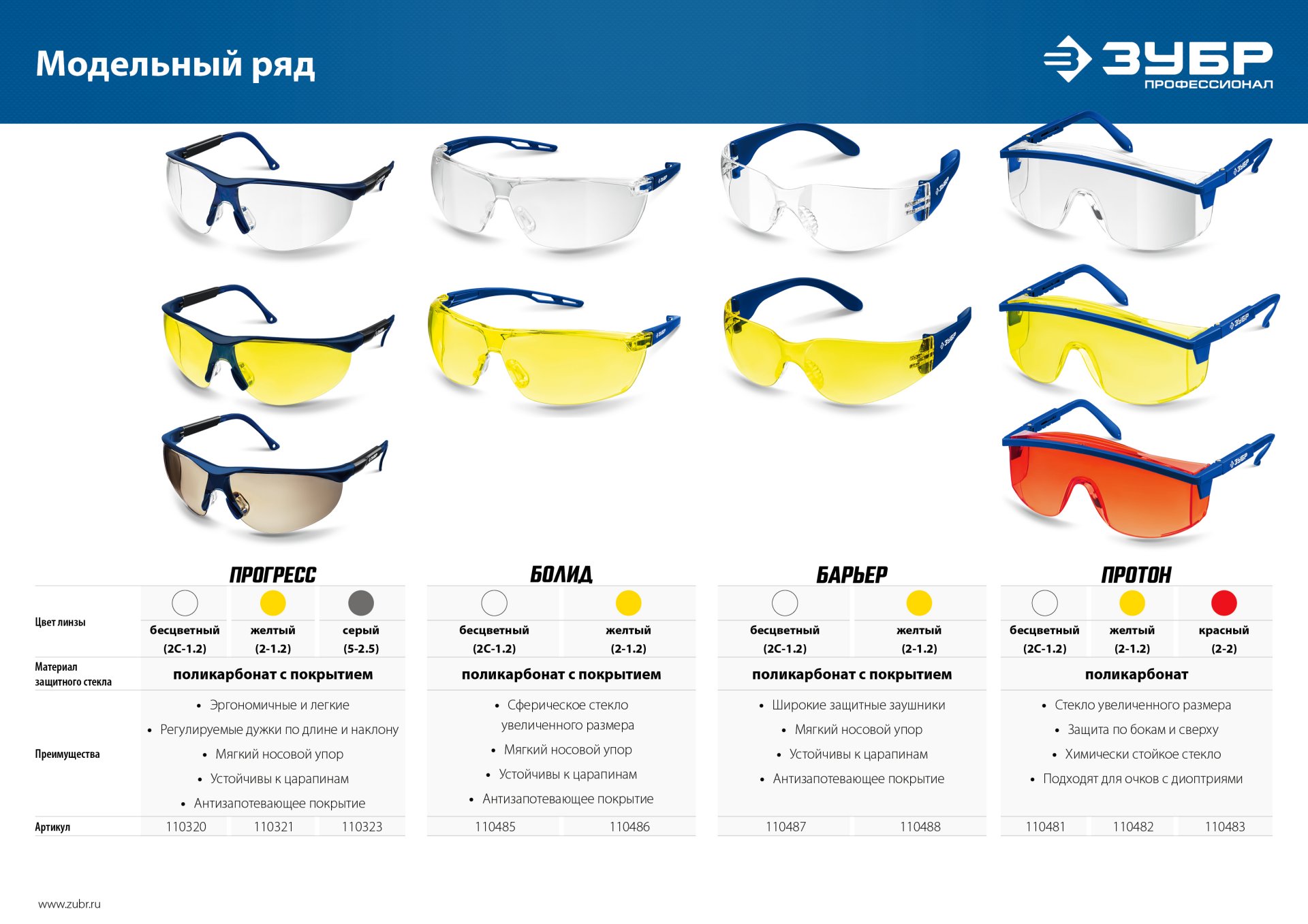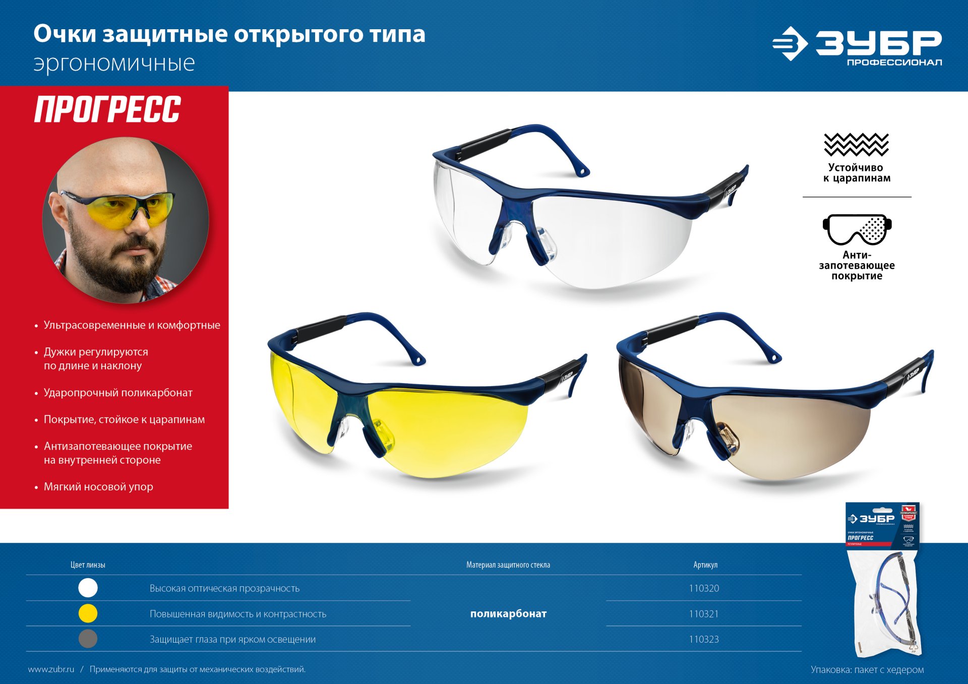 ЗУБР ПРОГРЕСС, открытого типа, прозрачные, стекло устойчивое к царапинам и запотеванию, защитные очки, Профессионал (110320), а также другие средства защиты труда вы можете купить в интернет-магазине zubr-vrn в Воронеже